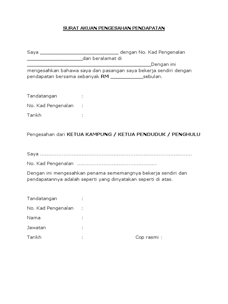 Docx, pdf, txt or read online from scribd. Keunggulan biaya keseluruhan menonjolkan harga lebih rendah dari pesaing. Surat pengesagan pendapatan bagi orang yang bekerja sendiri/ tiada majikan by maisarah_azmi_4 in types > letters, surat, and pengesahan pendapatan. Next post surdas ke dohe with meaning in hindi pdf. Contoh surat pengesahan pendapatan bagi individu yang tidak mempunyai slip gaji. Saya mengakui bahawa saya tiada penyata pendapatan atau slip gaji. Saya mengesahkan bahawa maklumat mengenai jumlah pendapatan yang dinyatakan adalah benar. Download & view surat akuan pengesahan pendapatan bekerja sendiri as pdf for free. Saya dengan ini juga mengesahkan penama sememangnya (bekerja sendiri/ tidak bekerja) dan pendapatannya adalah seperti yang dinyatakan di atas. Surat pernyataan tanggung jawab yang selanjutnya disingkat sptj adalah pemyataan tanggung jawab yang dibuat oleh kuasa pnpemimpin blu atas pendapatan danlatau belanja blu yang sumber dananya berasal dari pnbp yang digunakan langsung. Surat pengesagan pendapatan bagi orang yang bekerja sendiri/ tiada majikanfull description. Selepas mesyuarat senat universiti diadakan. Construction industry development board (cidb) malaysia cidb headquarters, 7 th.