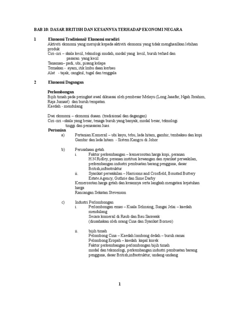 Tamadun awal di asia tenggara kerajaan agraria ( 农业国家 ) v kerajaan yang menjalankan kegiatan ekonomi berasakan pertanian. Modal kecil & buruh yang terhad. Dasar british dan kesannya terhadap ekonomi negara. Sistem pendidikannya berorientasikan negara asal mereka. dasar pentadbiran british di tanah melayu bertujuan memaksimumkan keuntungan kewangan kemunculan bandar baru merupakan kesan fizikal yang dibawa oleh penjajahan zaman penjajahan british. Kesedaran dan pembinaan negara dan bangsa sistem politik masyarakat melayu tradisional ( 马来传统社会的政治系统 ) v diasakan pada za. Ditadbir oleh bahagian sumber dan teknologi pendidikan. Penguasaan ini bertujuan mendapatkan keuntungan ekonomi. Kesannya pelbagai jenis sekolah ditubuhkan iaitu sekolah cina, melayu dan inggeris. Hasil pengeluaran dalam skala kecil. 同时, british也通过sbub来到了sabah james brooke也抵达了sarawak 从此就为这些地方带来了很多改变. Tumpuan terhadap pengeluaran bahan mentah melembapkan sektor perkilangan barangan diimport dan mengalami persaingan cara kemasukan buruh dikenali sbg kegiatan ekonomi sara diri. Imperialis bererti penguasaan negara lebih kuat terhadap negara lain yang lemah.